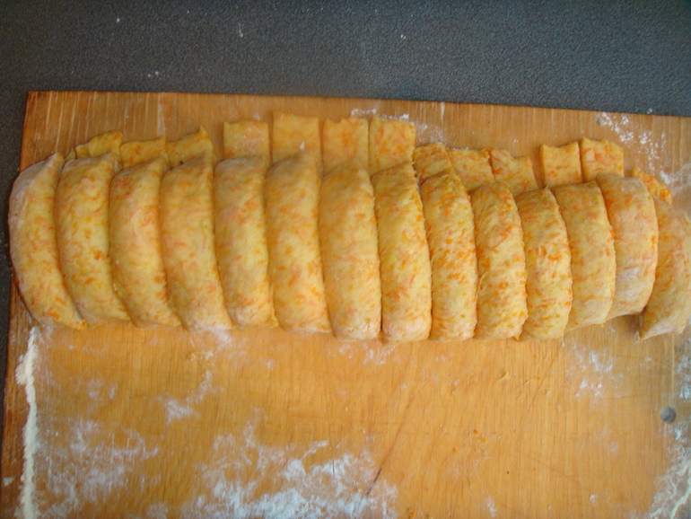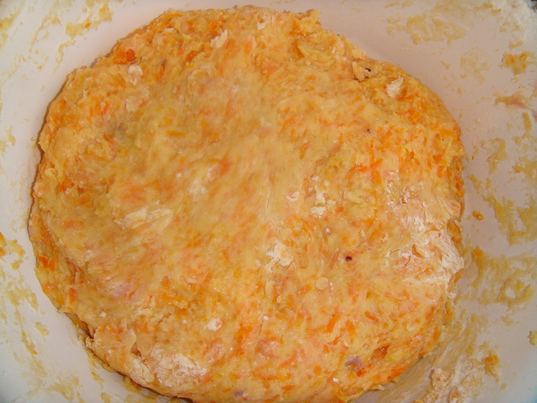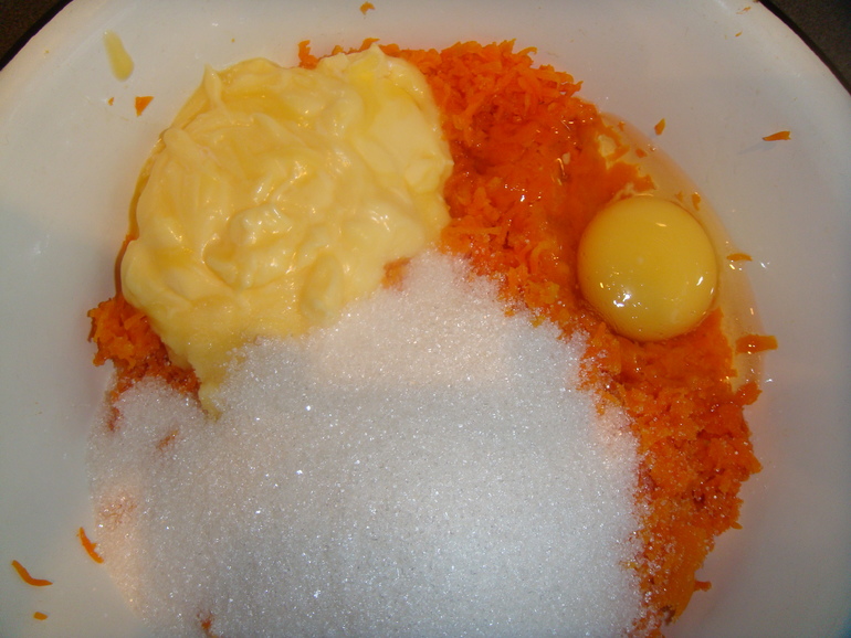 Натереть или протереть через сито 200 г моркови, добавить 50 г размягченного масла, 1 яйцо, 50г сахара, 0,5 ч.л. соли: