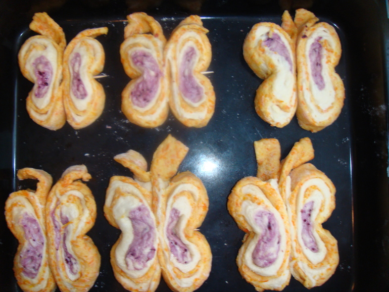 Опять посыпать сахаром, положить жгутик из темного теста: