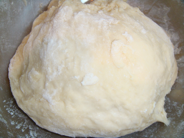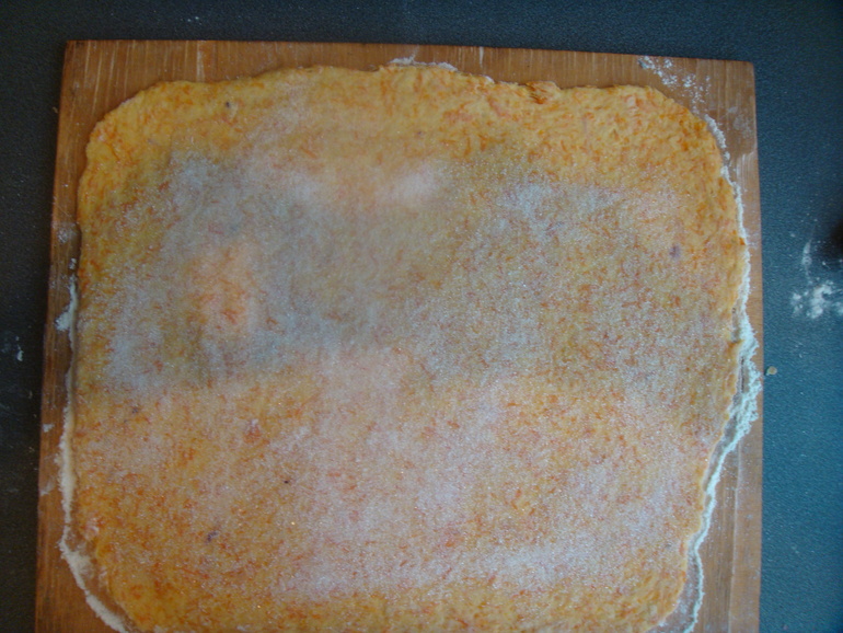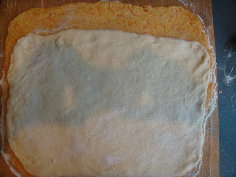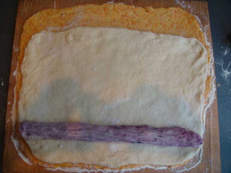 Когда тесто хорошо подошло, раскатать желтое тесто большим пластом: