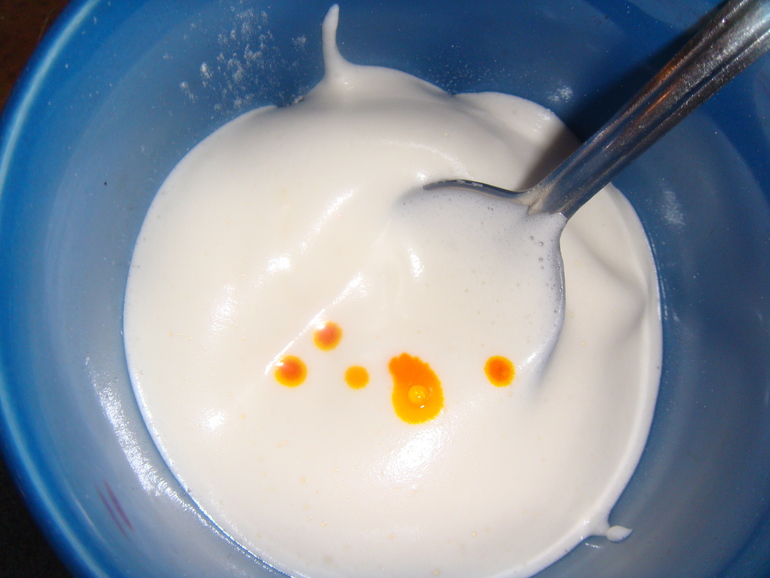 Отложить в чашку 4 ст.л. яичной массы. Смешать с 1 ст.л. муки и несколькими каплями желтого красителя: