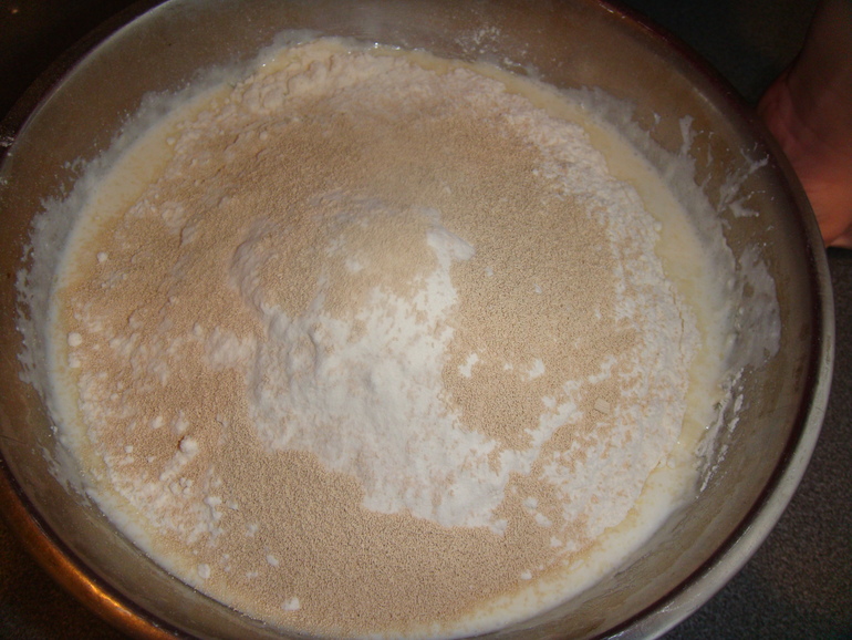 Нагреть 150 мл молока, добавить 50 г размягченного масла, 1 яйцо, 50 г сахара и 0,5 ч.л. соли. Всыпать 300 г муки и 1 ст.л. дрожжей: