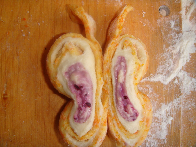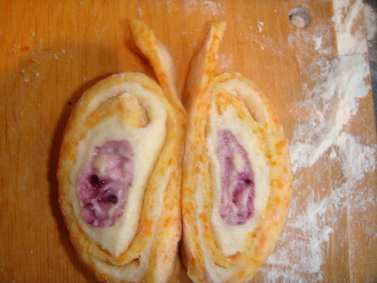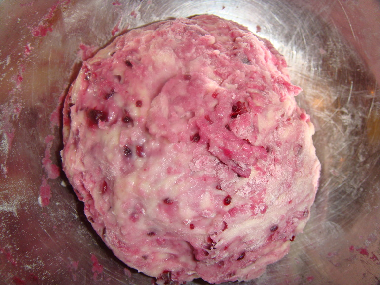 Отделить часть теста размером с кулак, добавить для цвета в него сок свеклы, черничное или черносмородиновое варенье: