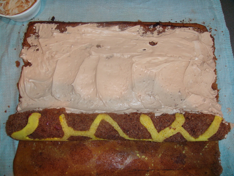 Остывший рулет аккуратно развернуть, снимая бумагу: