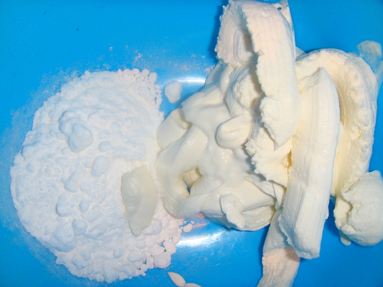 Постепенно ввести по ложке сладкий мягкий сыр (типа рикотты, маскарпоне):