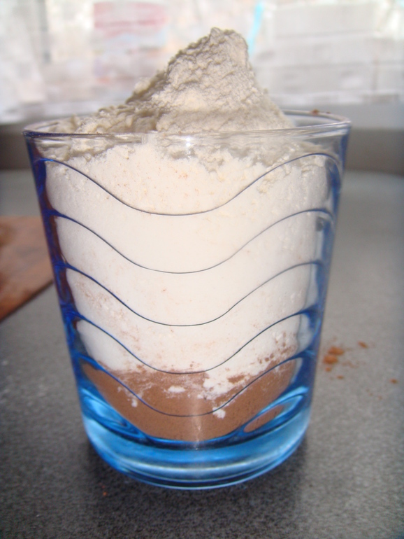 Поставить противень с узором в духовку. В это время приготовить 3 ст.л. какао, 1 ч.л. разрыхлителя, щепотку ванилина и до верха стакана муки:
