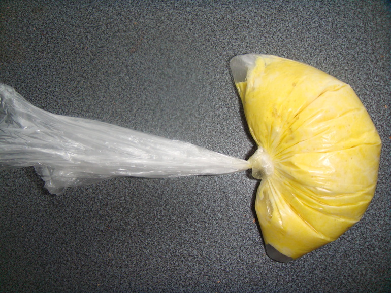 Переложить желтое тесто в пакетик, завязать, отрезать кончик: