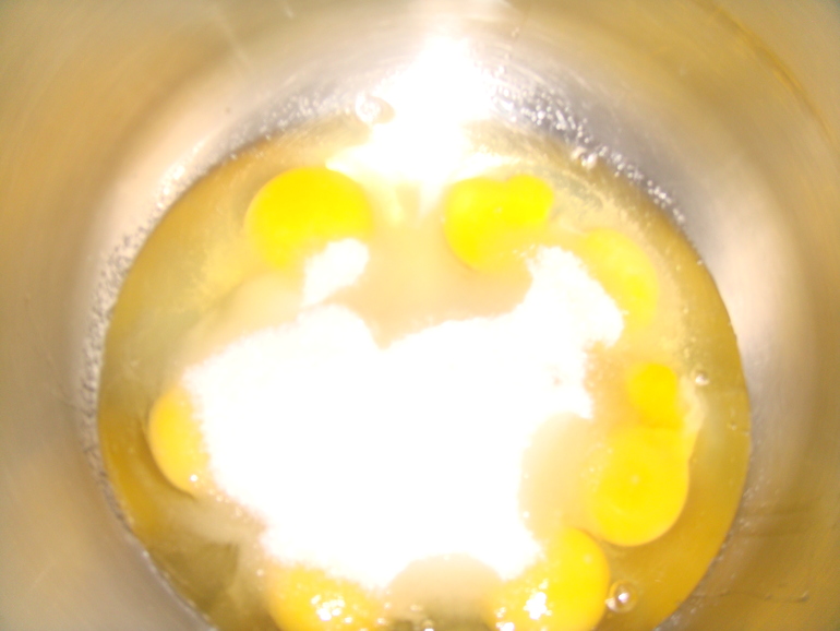 Взбить со стаканом сахара до пышности массы и увеличения объема в 5 раз: