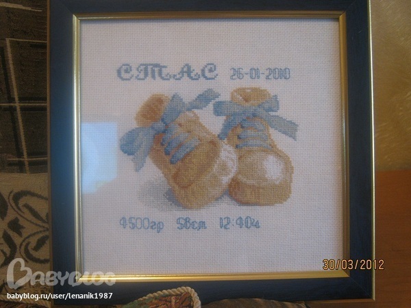 ВЫШИЛАСЬ ЗА ДВА ДНЯ....ДО ЭТОГО ВЫШИЛА МЕТРИКУ "МАЛЫШ НА ВЕСАХ", СХЕМУ БРАЛА НА САЙТЕ WWW.XREST.RU, НО ПОЛУЧИЛОСЬ ЧТО-ТО НЕ ОЧЕНЬ КРАСИВЕНЬКО....ВОТ РЕШИЛА ВСЕ-ТАКИ ДОСТИЧЬ СВОЕЙ ЦЕЛИ....