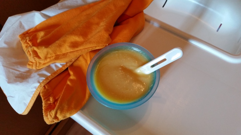 залила овощным бульоном и взбила блендером, добавила примерно 60 гр. баночного цыпленка - получился замечательный обед для Лео)