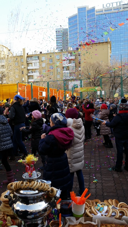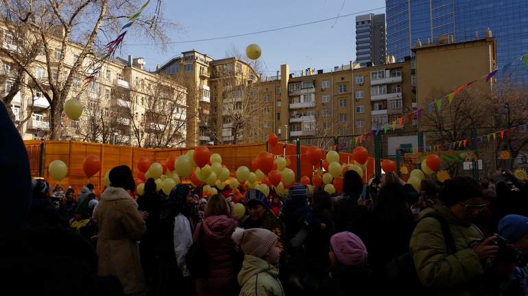 Ученики школы подготовили представление на тему "солнышко украли", наши первые классы были гномиками, которые вернули солнышко))) у каждого ребенка были привязаны по 2 шарика на руках и они в конце их отпустили)), а также хлопали много хлопушек!) Потом детвора перекусила и пошли участвовать в конкурсах - типа бои подушками и перетягивание каната))) при этом разабатывали жетоны и потом меняли их на сладости))