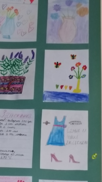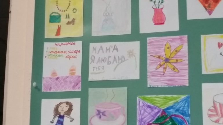 Еще детишки готовили рисунки для мамы, из них сделали коллажи и повесили в холле)