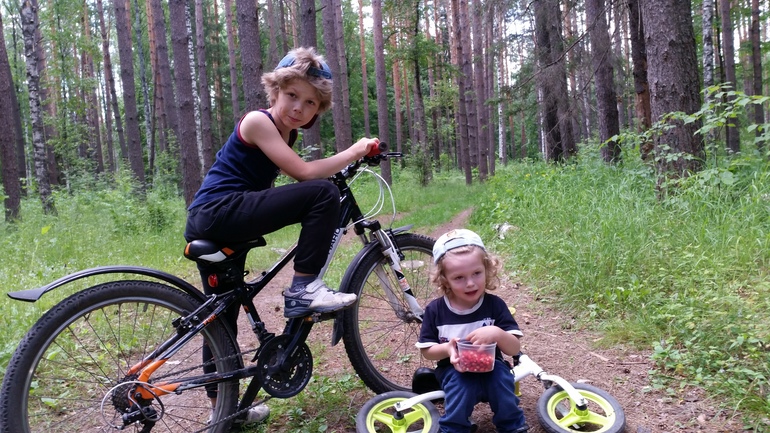 Утреннюю прогулку теперь проводим в лесу. Детям раздолье, машин нет, катайся как хочешь) и мне хорошо, 2-3 часа пролетают незаметно)). Сегодня они оба искали муравейники и Саня на каждом! показывал нам как определить север и юг))). Пока они бегали, я землянику собирала!)))