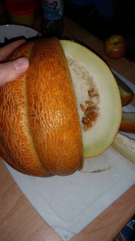 Сашулька 9 летМуж решил побаловать детей, купил дыню. Саня как увидел эту дыню, то признал её за тыкву))). Обрадовался, что папа ему большой светильник принес для Хеллуина))) и не очень обрадовался, что это всего лишь дыня и мы её съедим))