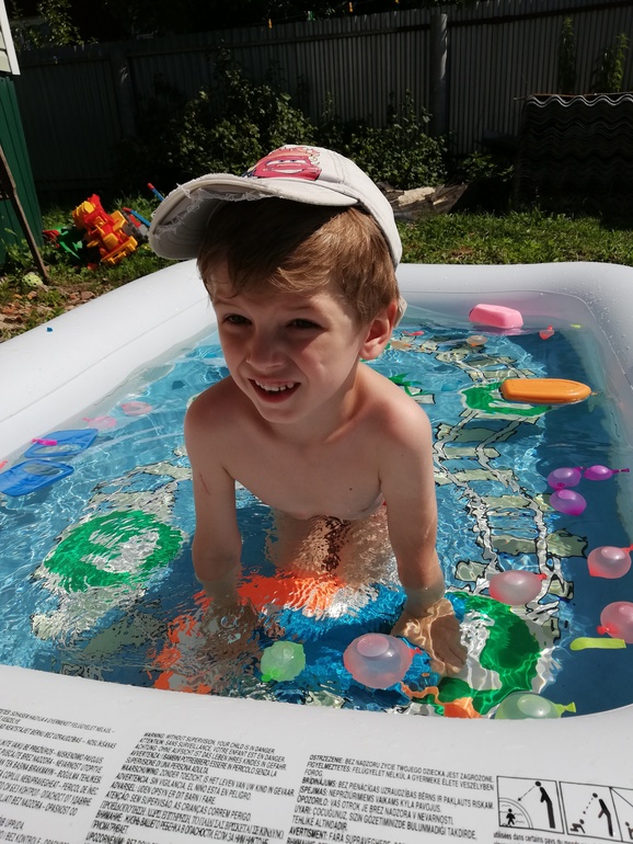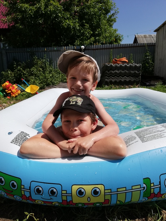К соседке привозят внуков, аж 3-х сразу, и они к нам приходят на батуте прыгать. Лев счастлив, вроде и есть с кем поиграть, и в садик ходить не нужно))