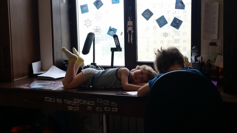 Теперь Лев ходит за Саней хвостиком, ни на шаг от него не отходит)). Саня доделывает работу по технологии, Лев рядом)