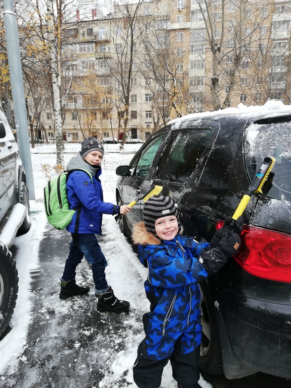 Утро началось с расчистки машины. Хоть его и мало этого снега, но почистить машину надо)))