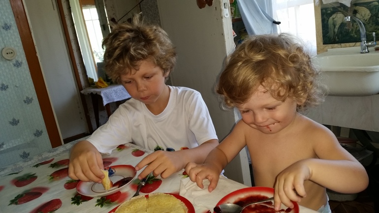 Как же хорошо, когда под боком есть бабушка)), для мальчишек - прабабушка!) Для неё святое всех накормить) вчера позвала утром на завтрак, на блинчики!)) Как удобно)), всех умыла, одела, 10 мин на великах и мы уже завтракаем только что испеченными блинчиками и джемом из смородины!))