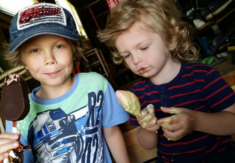 Позавтракали. Саня включил телик, Лев катается на велике.