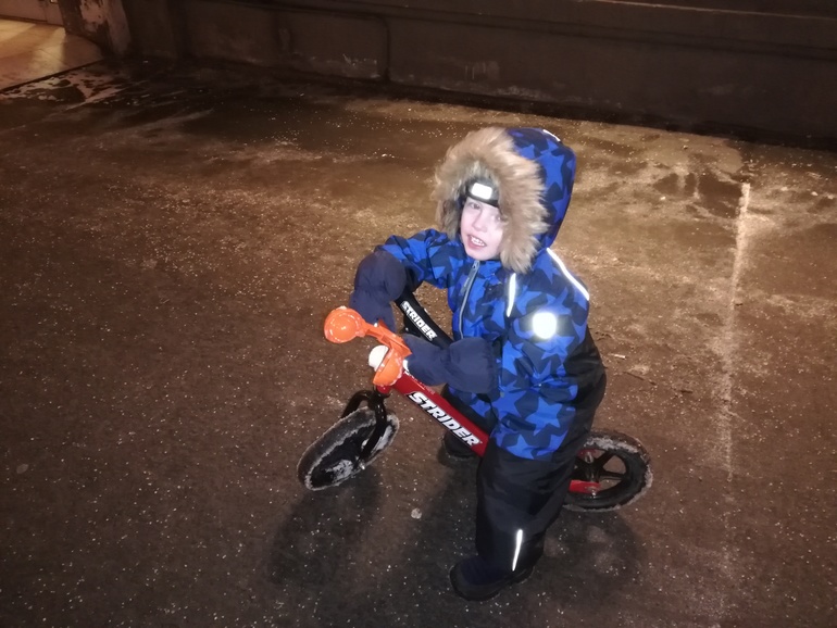 В Мск выпал снег и подморозило. Теперь в садик Лев едет на беговеле со снежколепом в обнимку)))
