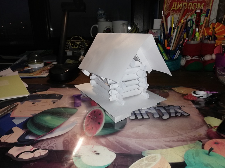 Всё сделал ребенок сам, сначала подставку, потом скручивали бревна и вот собрал избу.
