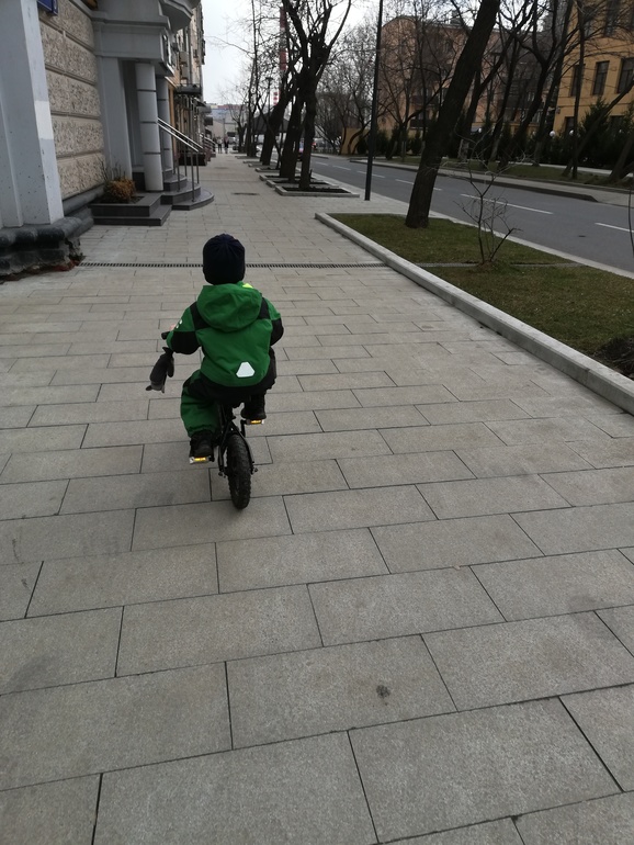 Т. к. снега нет и тротуары сухие, достали велосипед. Прошлогодний. Мне кажется, что он мал уже, да и доп. колеса нужно открутить, но Лев категорически против)))