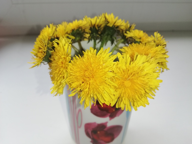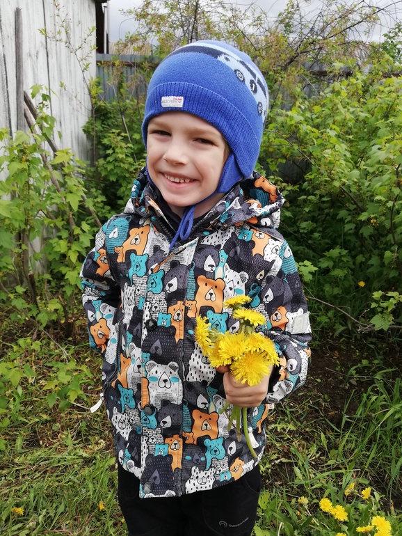 На участке полным полно одуванчиков! Лев нарвал букетик для меня!