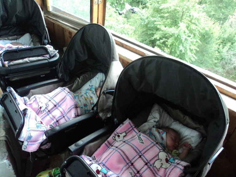 Бывае и на балконе спим,но последнее время не хотят.По 10 минут и все,просыпаются.