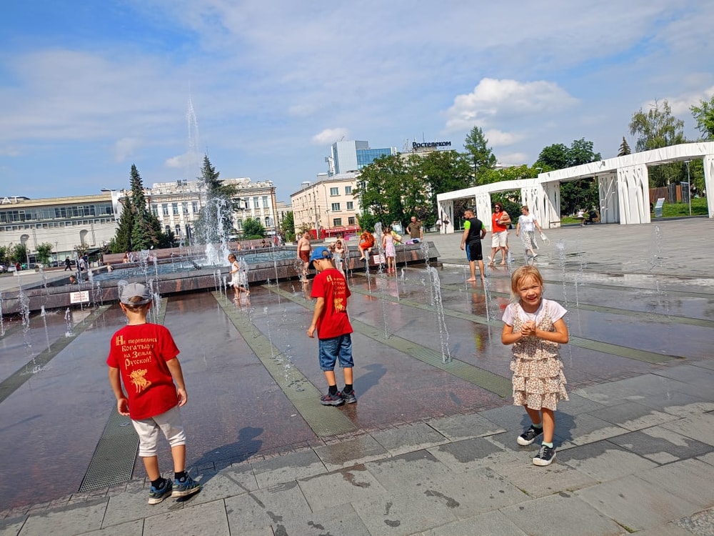 Мы шли гурьбой по широкому проспекту, рассматривая красивые вывески, витрины, картины, голубей, и вышли на просторную фонтанную площадь. Там среди фонтанчиков носились раздетые до трусов дети, насквозь мокрые и полностью счастливые. Мы с опаской смотрели в их сторону, предвидев картину, как приходим в кафе с вымокшими детьми, а потом сажаем их в наш новенький "соболь". Вовремя спохватившись, мы успели выловить из фонтанов своих особо шустрых детей, и зашли в ближайшее кафе. Особенно нас привлекла в нем детская площадка с горками и батутами, ради нее было не жалко и подороже заплатить за еду.
