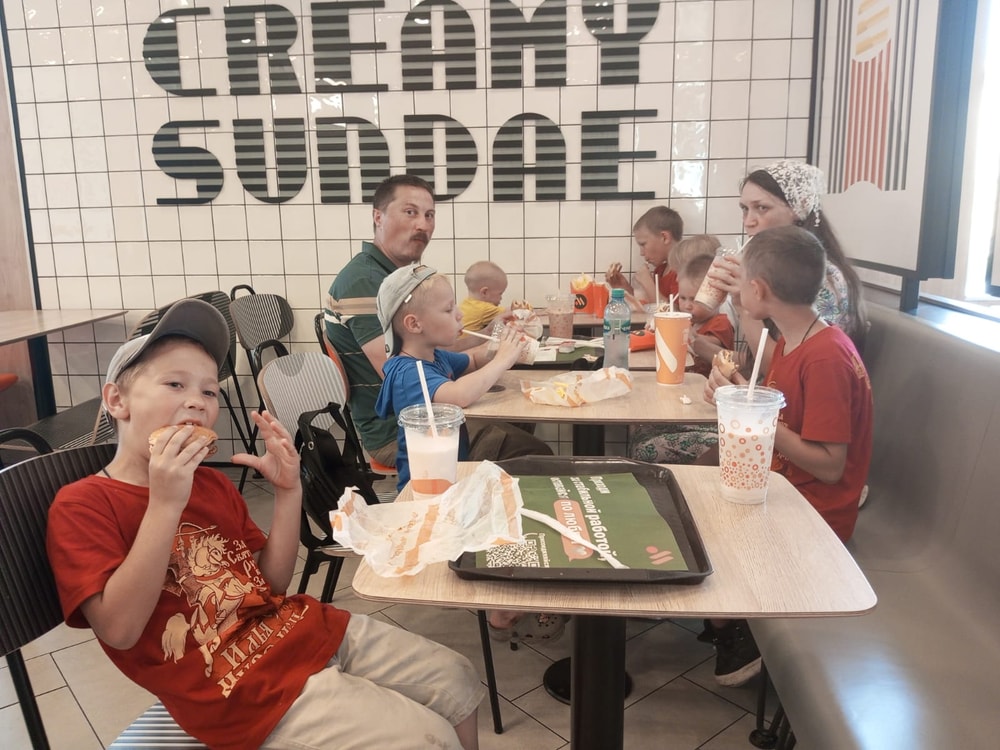 Ожидание казалось бесконечным. Голодная малышня усиливала хныч. Каждый выходил из себя по-своему: Софрон с воплем пытался вылезти из детского стульчика, Проша ныл, повторяя фразу:"хочу есть!", Лука непрерывно сквозь плач вопрошал: "Ну скоро уже?! Маааам..." Старшие сидели с кислыми минами и периодически пытались как-то развлечь мелких. Наконец, появился Сережа с подносом. Мы еле дожили до этого счастливого момента. Все с удовольствием приступили к поеданию чизбургеров и картошки фри. Софрону очень понравилось, как летят со стола картофельные брусочки, так что половина его пачки уже оказалась на полу. Но довольно быстро все насытились и наступила благословенная тишина. Все снова улыбались и шутили, и пришла пора двигаться на турбазу. Быстро убрав за собой, мы снова вышли на проспект.