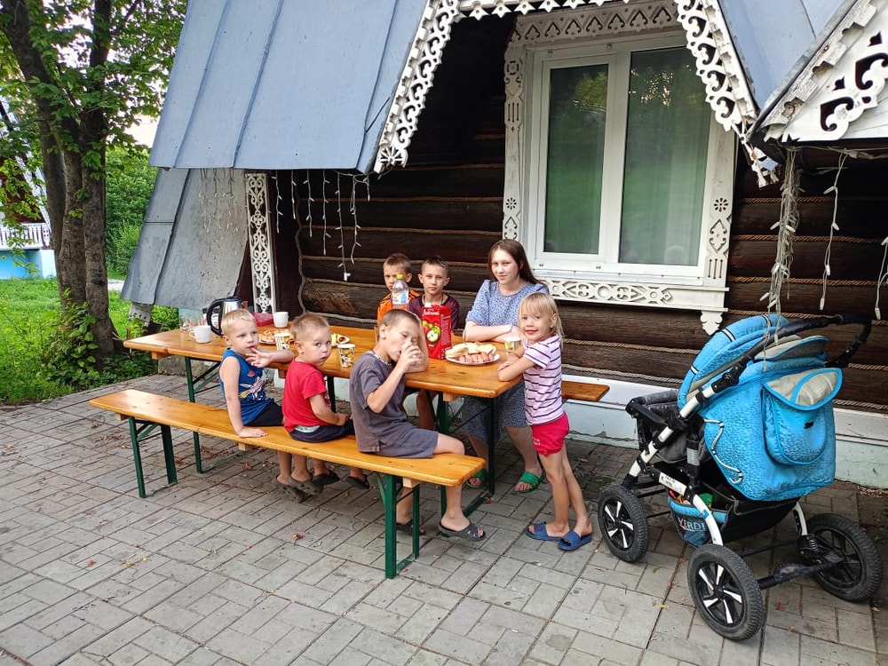 В домике дети быстрее нас поделили комнаты и распределили вещи. Мы накрыли ужин на уличном столе. Мокрые полотенца повесили на балкончике. Почувствовалось курортное настроение. У соседей играла музыка 90х, дул теплый ветерок. Мы налили чай, а детям лимонад, поздравили друг друга с прекрасным отпуском и приступили к трапезе.