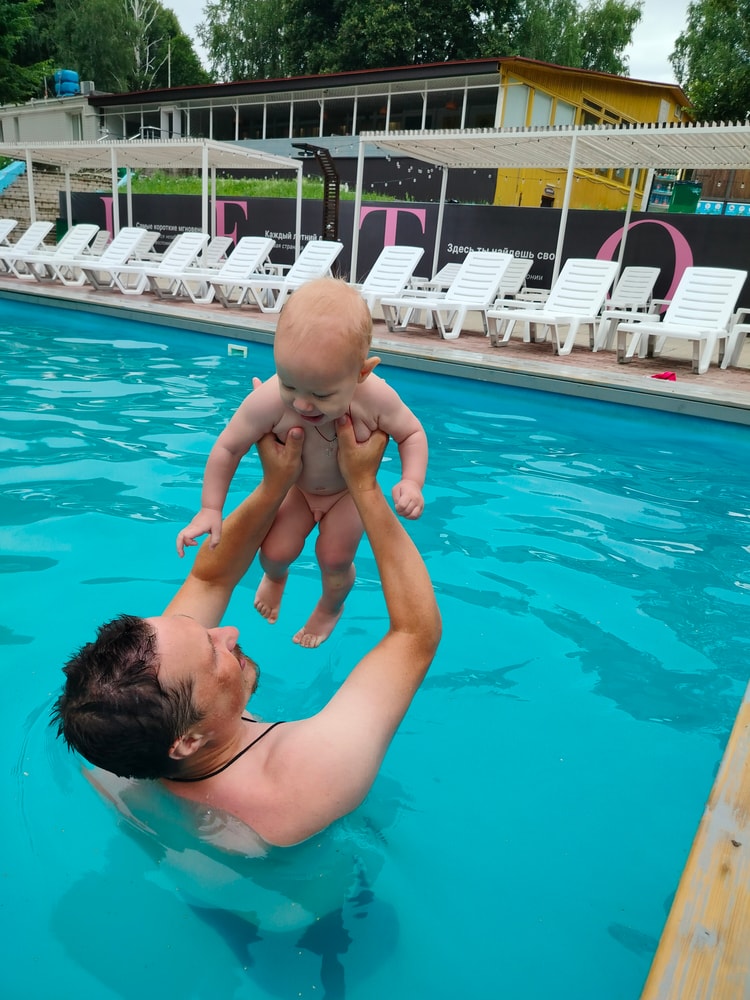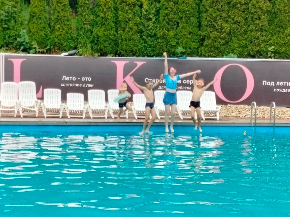Огромный лазурный бассейн вызвал восторг и непреодолимое желание быстрее нырнуть. Старшие надели маски и попрыгали в воду. Малышам раздали надувные атрибуты. Брызги, визги, смех, "мам, смотри!", прыжки в воду, в общем, накрыло всех счастье. Кирилл нырнул на глубину и нашел чью-то затонувшую машинку. Правда, вскоре Проша заныл, запросился на сушу. Мы его вытащили, обтерли полотенцем. Но он снова захотел купаться. Пока спускали его на воду, Софрон подполз к борту бассейна, пришлось его хватать на руки. Сережа плавал с детьми и следил за ними на воде. Вскоре он снова вывалил на берег ноющего Прошу, и мы пошли гулять по территории. Все это время Проша категорически требовал держать его за ручку, а Софрону пришлось висеть на оставшейся одной руке. Мне искупаться больше не довелось, с радостью наблюдала за восторгом детей со стороны. Главное, успели до грозы.