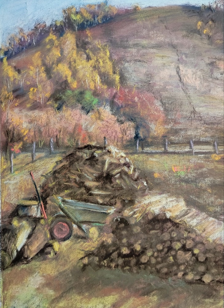 Вчера мне предложили начать рисовать с натуры... Конечно, не портрет, но впервые попробовала выйти на пленер. Захотелось выползти на солнышко и запечатлеть наши живописные дровишки 😁
