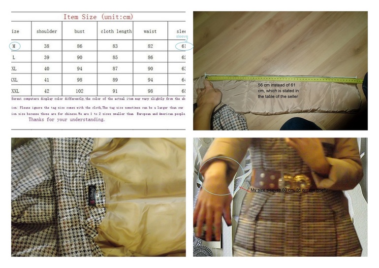 2) рукава короче заявленной длины на 5 см( вместо 61см -56см),естественно рукав мне короткий(у меня 60 см длина рукава).