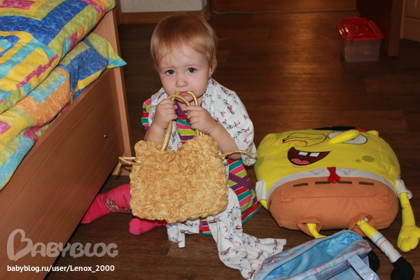 А недавно нам подарили сумку, маленькую такаю, так она наталкает в неё всякой всячини, и такая деловая ходит по всей квартире с ней.