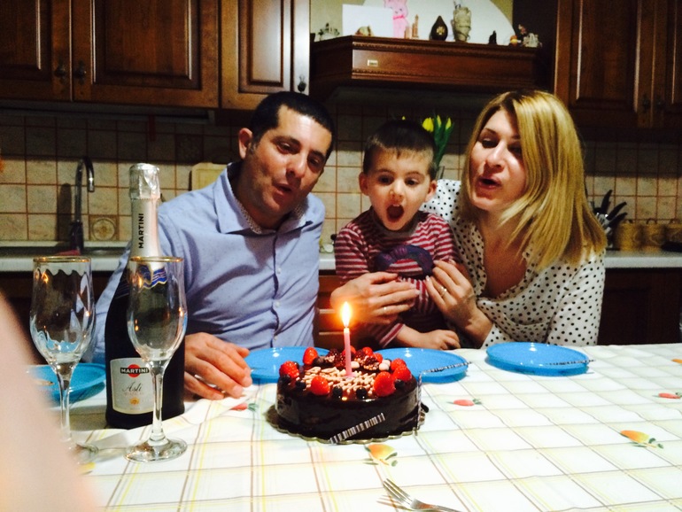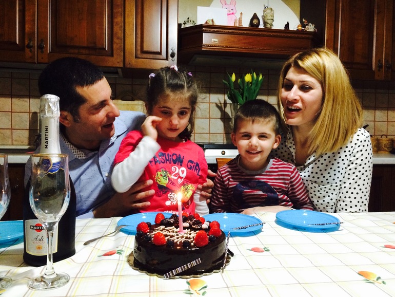 Хочу написать как у нас дела . В конце июня у Алессии был выпускной в саду, выдали дипломы и дети с родителями ходили в пиццерию.Воспитатели подарили выпускникам большой торт и кучу приятных воспоминаний ! Где-то на фото видно даже Мотю.