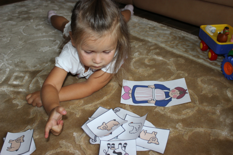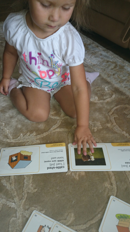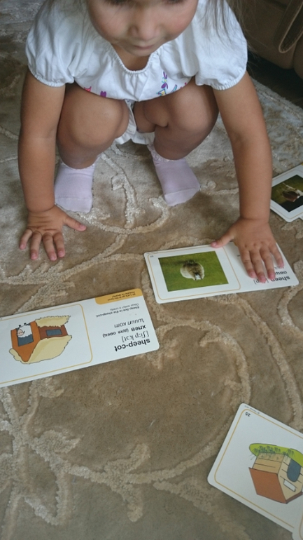 Потом найти животных и их домики. Благо их три всего. Да и на карточках нарисовано, кто, где живет. Не сложно догадаться. При этом я не говорю с ней на русском все на английском!!