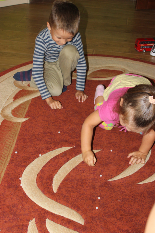 Рассыпьте по комнате горсть белых крышечек от пластиковых бутылок или мячиков от пинг-понга - это зубки. Выберите роли, например, мама пусть будет зубной щеткой, а малыш кариесом (если детей двое, как у меня, роли между ними распределила). Кариес собирает зубки в свою коробку, а щетка в свою, коробки поставьте в разные концы комнаты. Правило одно - за один «ход» можно унести только один зубик. Кто соберет больше зубиков?