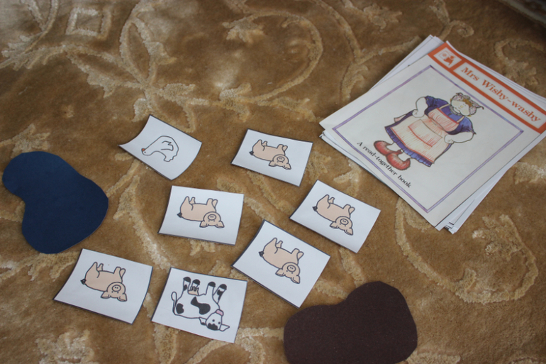 После прочтения поиграли в миссис Виши-Воши. Смысл игры прост. Чистые животные захотели поплескаться в грязной луже. С одной стороны карточки с животными чистые, с другой-наоборот. Потом пришла старушка и устроила всем большую мойку :)).