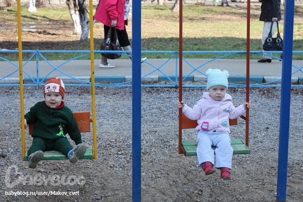 Во вторник 24.04.12 мы первый раз катались на качелях и каруселях. Качели очень понравились - просто восторг.