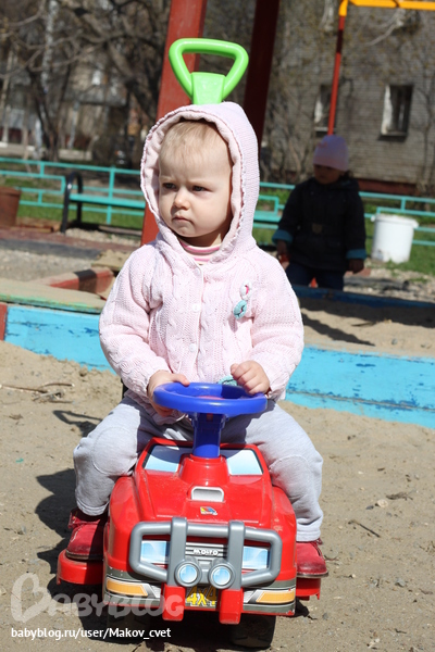 на чужой машине, мальчик Женя дал покататься, но Ксюше больше всего в этой машине музыка понравилась. Вид у неё здесь, как всегда, ОООЧЕНЬ СЕРЬЁЗНЫЙ.
