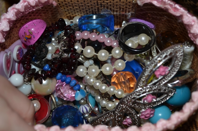Затем рассказала, что из этих камней делают украшения. Достали свои "сокровища" , в доме растут три девочки, этого добра у нас несметное количество (не настоящего, для игры конечно ,но очень похожего на настоящее)!