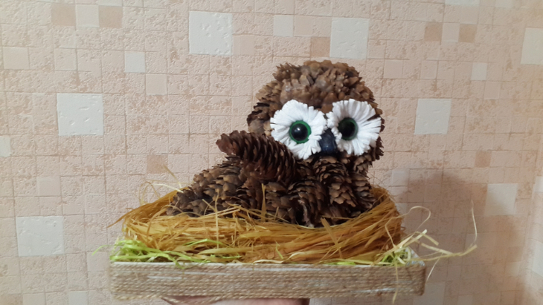 Решили с сыном сделать на конкурс в школу мудрую сову, а получился неопытный совёнок) Такой милаха вышел, аж самой нравится. Ароматный малыш получился) Основа из пластилина, далее в пластилин втыкали разрезанные вдоль шишки. Раз не получилось взрослой птицы, решили посадить малышастика в гнездо.
