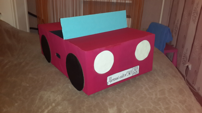 У Сашульки в садике проходили гонки на самодельных машинках. Вот такую бибику мы смастерили за 6 часов до старта. Не судите строго. Хотели сначала покрасить, но краска из болончика впиталась и получился просто отвратительный цвет( Пришлось на скорую руку обклеивать тем, что оказалось под рукой.