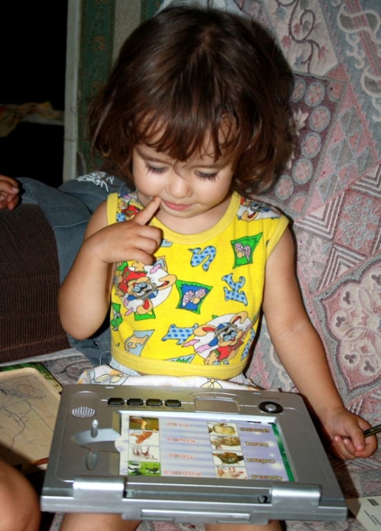 Тетенька в ноуте дает задание найти предметы. и надо нажать на кружочек в центре картинки, потом говорит верно или ошибка)) как показала, Тася сразу поняла что надо делать, куда тыкать, очень радуется успеху))). Карточек у нас большая стопка. от найди фрукт, до решения примеров по умножению)