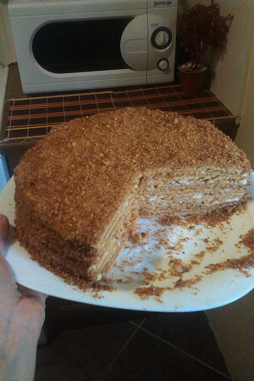 Спекла его любимый медовик со сметанным кремом! Тортик хорошо пропитался и получился безумно вкусным!! С утреца муж почти пол тортика слопал)))