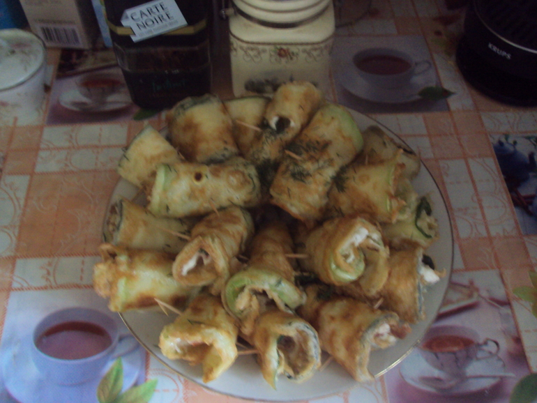 Ингредиенты: Кабачки - 2-3 шт. Помидоры - 3-4 шт. Сыр - 200 г Чеснок - 2-2,5 головки Зелень - 2-3 пучка Майонез - 100-150 г Яйца - 4-5 шт. Мука - 6-8 ст. ложек Масло растительное - 100-200 г Соль - 1-1,5 ч. ложки Молодые кабачки нарезать вдоль тонкими ломтиками. Посолить и оставить на 10-15 минут. Сыр нарезать небольшими тонкими ломтиками. Чеснок очистить. Помидоры нарезать кубиками или дольками. Для кляра слегка взбить яйца. Сначала обвалять кабачковый язык в муке, затем - во взбитом яйце. На сковороде разогреть растительное масло. Обжарить языки на среднем огне по 5 минут с каждой стороны. Ломтики должны стать мягкими. Горячие обжаренные кабачки выложить на тарелку, намазать майонезом. С одной стороны положить кусочек сыра, с другой стороны - ломтик помидора. Затем выдавить на кабачок чеснок и выложить горсть зелени. Свернуть кабачок рулетом, начиная с того края, где лежит помидор. Выложить на тарелку так, чтобы краешек был сверху. Заколоть кабачковый рулетик зубочисткой. Закуска "Тещин язык" готова!