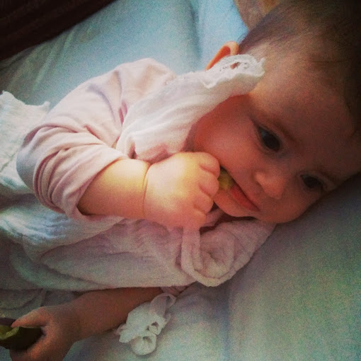 Большая проблема накормить ее фруктами :( нормально съела только кусок арбузика. Остальное - хихикает и плюется, никак не запихать