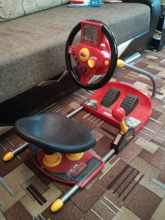Продам авто- тренажер или эмитатор машины, сама не знаю как это называется. Данная конструкция имеет руль, педали, коробку переключения передач. Ребёнок был просто в восторге от неё, сейчас просто уже выросли. На руле много кнопочек и дорога с машинкой. При включении дорога двигается, что создаёт иллюзию движения. Ребёнок сидит на сиденье, переключает передачи, нажимает педали и крутит руль. В общем одно удовольствие. Сидушка имеет несколько положений в зависимости от размера малыша.