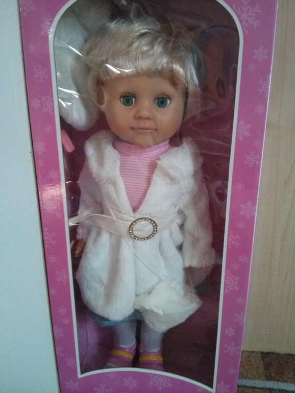 Кукла умеет поворачивать голову, разговаривать, открывать рот, петь песни. В общем красота. Сделана очень хорошо. Но одно но, так как это ветринный вариант, то немного подпорчена коробка, а так в целом все отлично. Совсем новая, по цене б\у