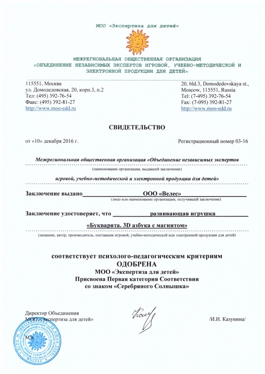 Магнитной азбуке "Букварята" присвоено "Серебряное солнышко" и одобрено экспертизой для детей!